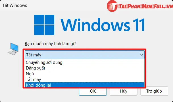 - Cách 2: Nhấn tổ hợp phím "ALT + F4" => Bảng khởi động hiện ra chọn "khởi động lại máy (Restart)" sau đó nhấn OK