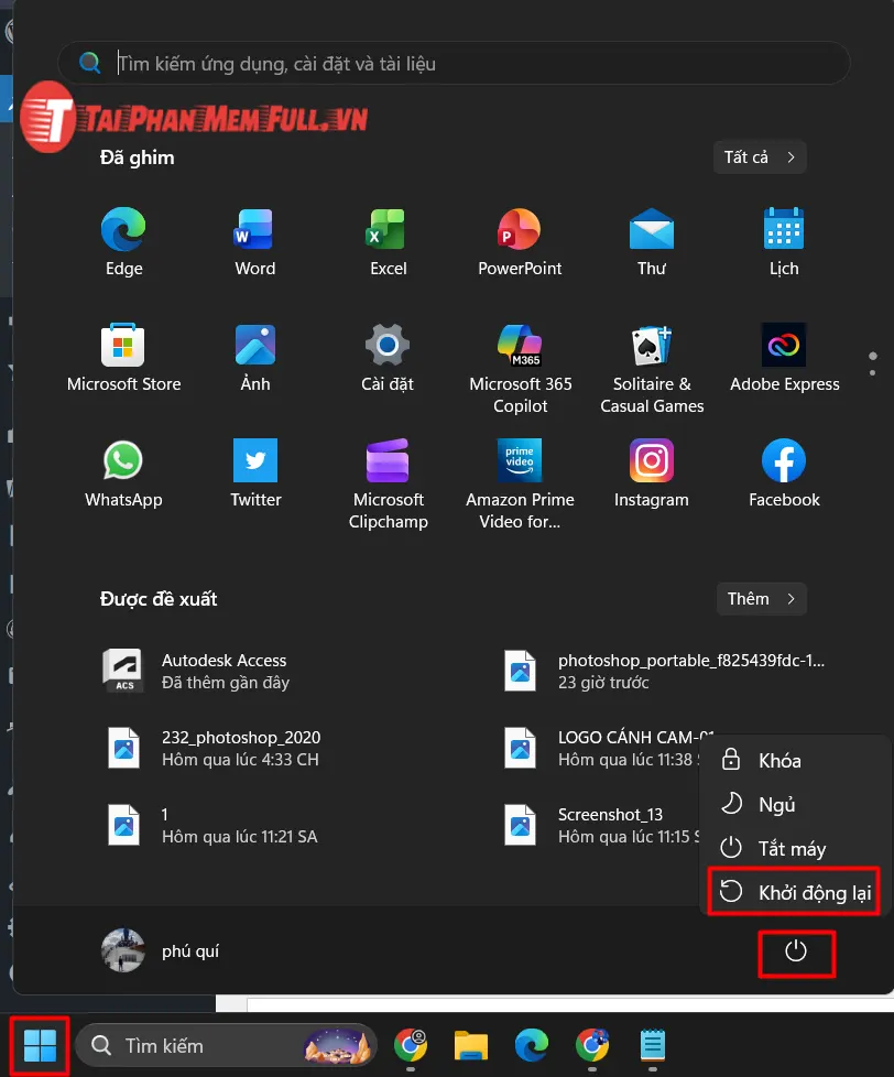 - Cách 1: Vào góc trái dưới màng hình để chọn biểu tượng Windows 🪟 => Chọn nút nguồn ⏻ => chọn khởi động lại máy (Restart)