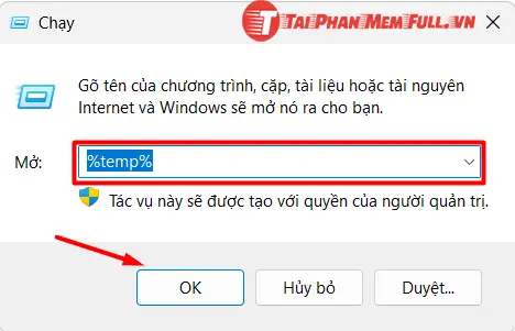 - Vào thanh tìm kiếm của Window => Tìm mục "Run" sau đó nhấn enter để mở => Trong "Run" nhập %temp% nhấn enter để mở mục => xóa tất cả mục có trong %temp%
