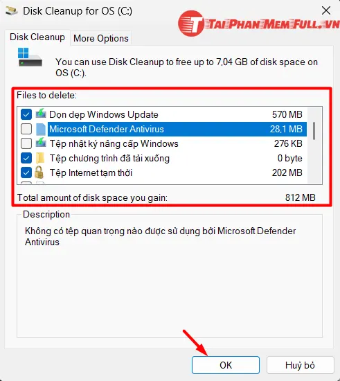 - Bước 4: Máy sẽ mất vài giây để quét lại. Sau khi danh sách mới hiện ra, bạn hãy tích chọn tất cả các ô có dung lượng lớn (đặc biệt là Windows Update Cleanup, Temporary files, Recycle Bin...) và nhấn OK => Chọn Delete Files.